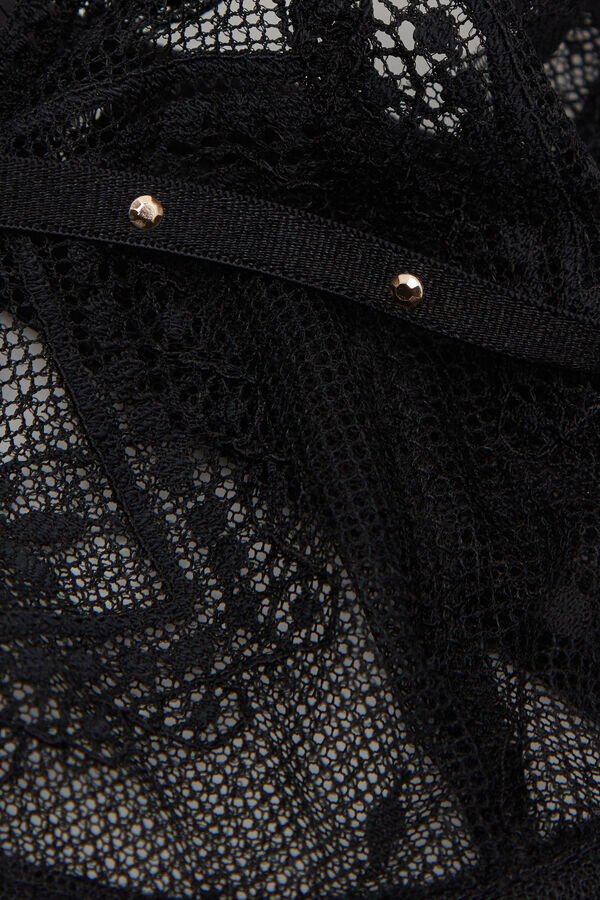 balconette-bh i mjuk stretchspets med geometriskt motiv i kombination med elegant prickig tyll. Den har ett elastiskt motiv vid dekolletaget och guldnitar på axelbanden. Liten rosettdetalj i mitten av bysten med guldkant. Bekväm och skön, ger en mycket sensuell och spännande effekt även för mindre byster.