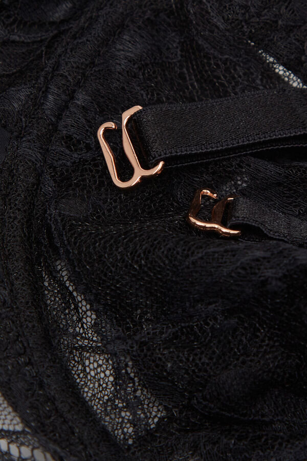 bandeau-balconette-bh tillverkad av elegant och sensuell blommig chantilly-spets. raffinerad detalj i form av ett roséguldfärgat tillbehör i mitten av bysten. perfekt för dig som letar efter en sensuell och feminin bandeau-bh för en speciell tillställning eller som alternativ till en enkel bandeau-bh i mikrofiber.