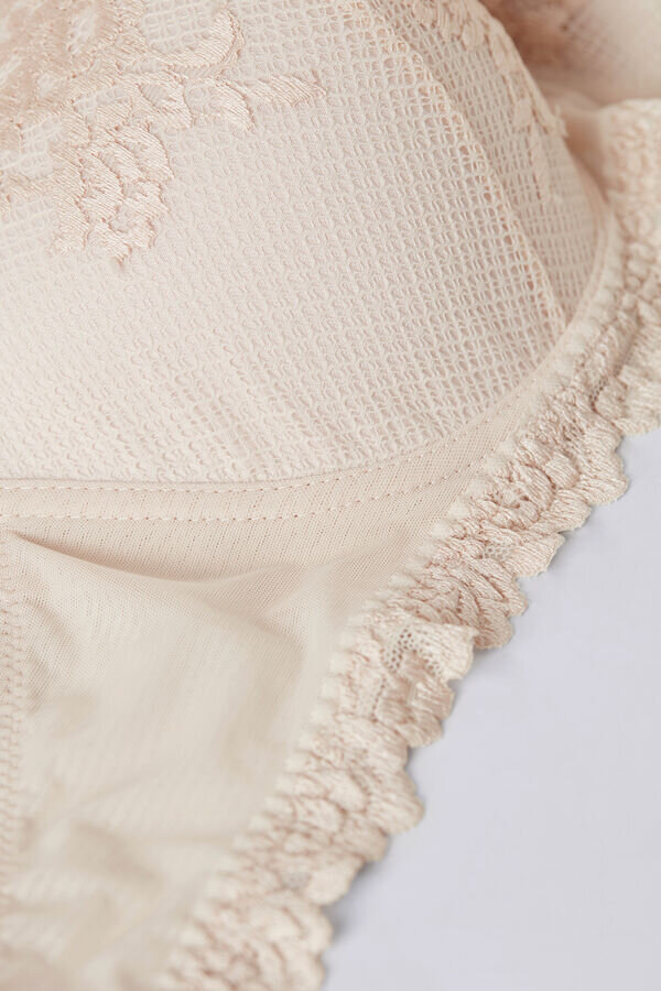 Sofia balconette-bh med lätt vadderade kupor och bekväma bygel som omfamnar och stöder bysten. Den är tillverkad i elegant och raffinerat spets som finns i tvåfärgade eller ton-i-ton-alternativ. Underbandet är fodrat med tyll för att säkerställa bättre passform. Axelbanden är justerbara i ryggen. Underbandet i större storlekar är bredare och en stödinsats är infogad i kuporna för att bättre omfamna och stödja bysten. Det är en design som ger optimalt stöd och framhäver dekolletaget, rundar formen för en feminin och sensuell stil.