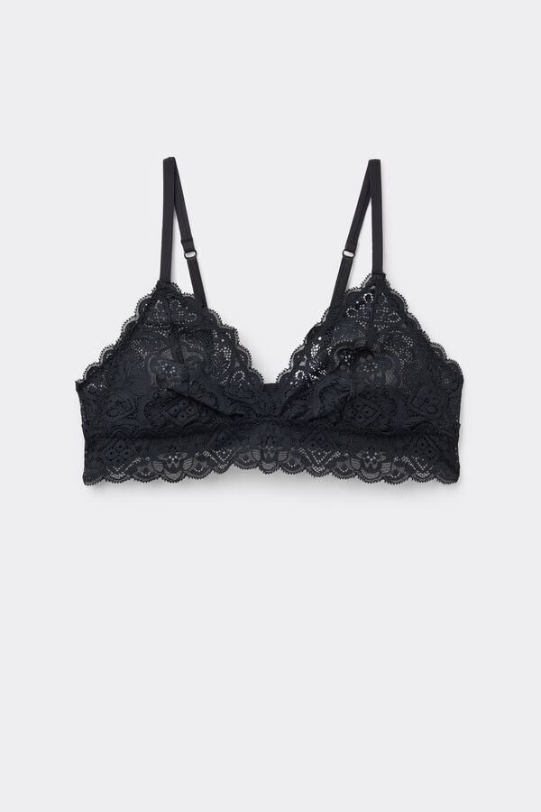 Emma triangell-bh i mjuk stretchspets. mikrofiberfodrad underbåge dold av en spetsvolang som ger en bralette-effekt. spetsdetaljer på sidorna av kuporna. romantisk och feminin stil.