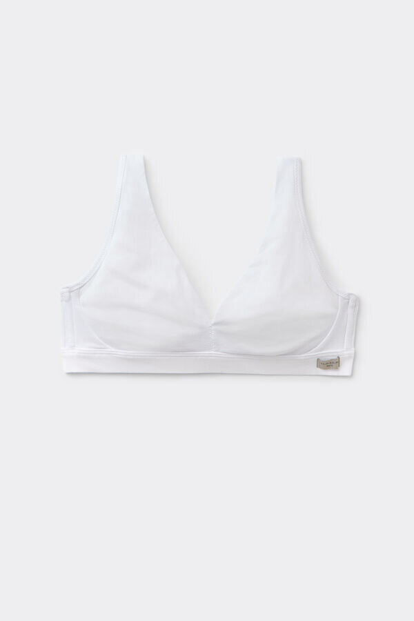 vår lara triangulära bh i bomull är ett vardagsplagg som är designat med mjukhet och enkelhet i åtanke. den är tillverkad av stretchbomull och ger din underklädeslåda ett naturligt lätt plagg som känns andningsbart och skonsamt mot huden. Denna bh utan bygel och vaddering har en smidig silhuett som sitter diskret under kläderna, ett val som balanserar mjukhet med diskret stöd för vardagen. Breda axelband flyter sömlöst från kuporna för en ren, stödjande passform, med justerbara band i ryggen så att du kan anpassa den efter din kroppsform. Diskreta sidostöd och ett underband i bomull hjälper till att stödja bysten, medan dolda meshförstärkningar i utvalda storlekar säkerställer formning där du behöver det mest. Från stretchbomullen till det dolda meshstödet samverkar varje detalj för att ge dig lätt formning och bekvämlighet hela dagen. Denna bomulls-BH med breda axelband är den typ av plagg du kommer att fortsätta att använda, eftersom den ger bekvämlighet, komfort och Intimissimi-elegans i din vardag.