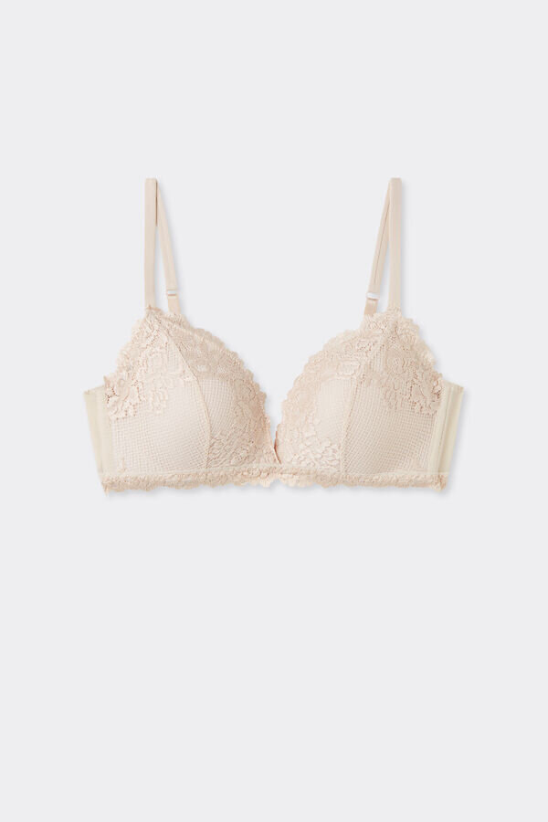 tiziana trådlös triangel-bh med lätt vadderade kupor och sidostöd som försiktigt formar bysten. den är tillverkad i sofistikerad och elegant stretchspets med ton-i-ton- eller kontrastfärgade blomsterbroderier, beroende på version. axelbanden är fodrade med mikrofiber och justerbara i ryggen. Denna bh formar bysten på ett subtilt sätt och ger lätt stöd.