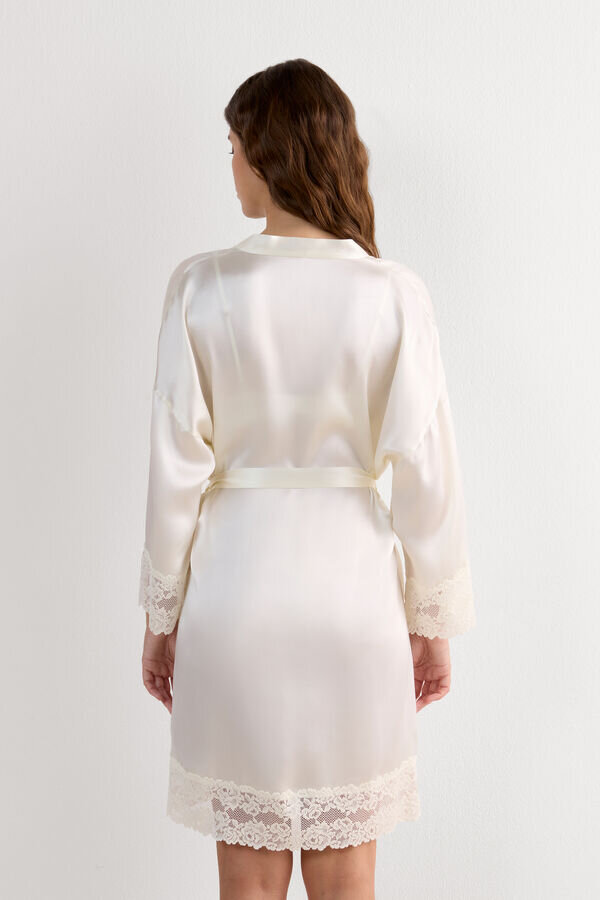 elegant och raffinerad silkeskimono med vackra spetsvolanger.