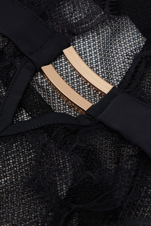 bodysuit med mesh-tyllöverdel dekorerad med elegant och sensuell blommig chantilly-spets. mikrofiberkant och fin detalj i form av ett roséguldfärgat smycke i mitten av bysten.