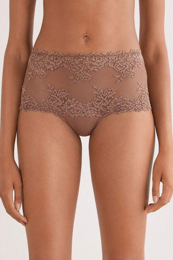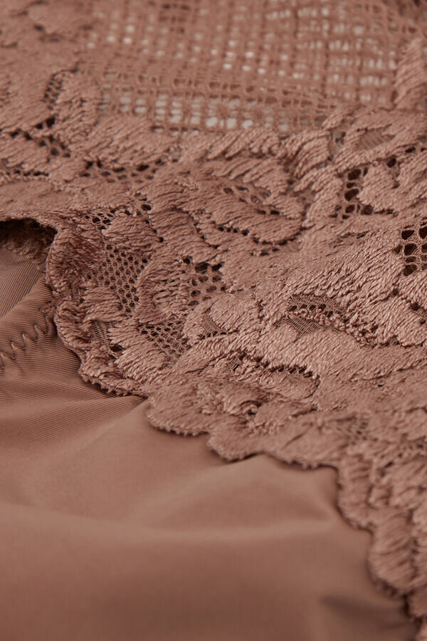 höga Brazilian hipster-trosor i spetsvolang med mjuk mikrofiber i nedre delen. beroende på vald färg kan spetsen vara i kontrastfärg eller ton-i-ton. högt skurna sidor. innerficka i 100 % bomull.