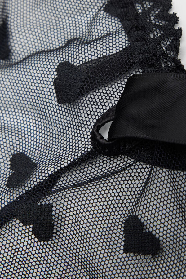 hipster-trosa i hjärtmönstrad tyll med romantiska hjärtmotivbroderier och volanger. satinbandet är avtagbart och kan även användas som en lekfull choker eller håraccessoar.