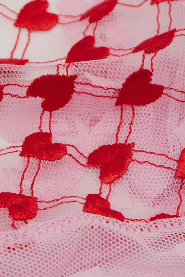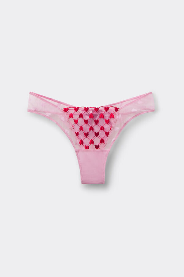 Brazilian trosa i romantisk hjärtbroderad tyll med hjärtvolang och satindetaljer på baksidan. satinbandet är avtagbart och kan även användas som en lekfull choker eller håraccessoar.