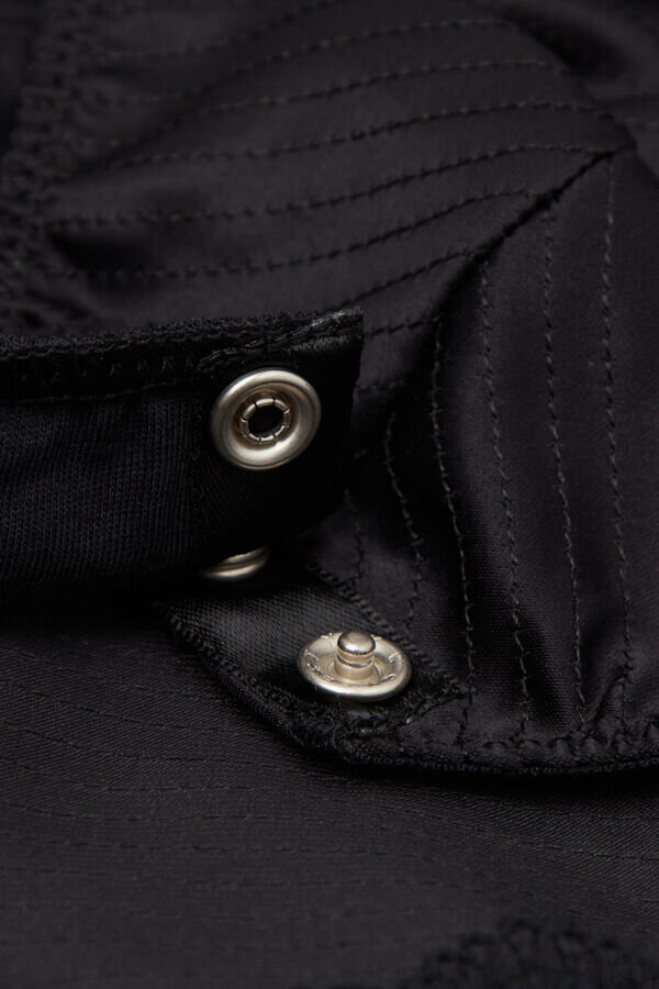 bodysuit i spets med satinkant och sofistikerade sömmar som påminner om en elegant retrostil. halsringningen framhävs med en v-formad bygel och ribbningen skapar en bustier-effekt. perfekt att bära både separat och under en jacka.