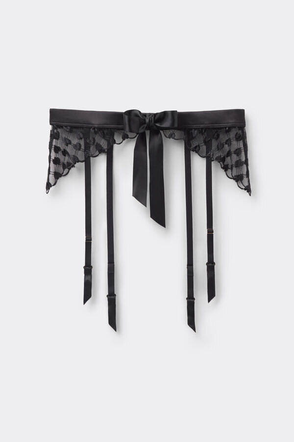 strumpebandshållare i romantisk tyll med hjärtbroderier och sensuell satinkant. satinbandet är avtagbart och kan även användas som en lekfull choker eller håraccessoar.p>