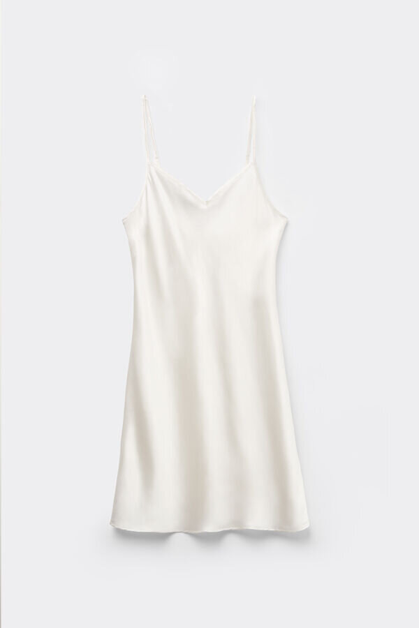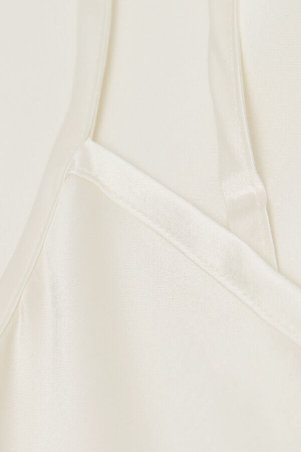 slät silkesunderklänning med justerbara, smala axelband och en diskret v-ringning. perfekt att bära under klänningar för en elegant silhuett. Modellen är 175 cm lång och bär storlek S.