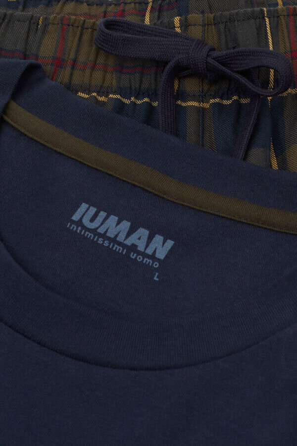kort pyjamas med mjuk enfärgad bomullsjersey-tröja med tartanmönstrad ficka i slätväv. bomullsbyxor med tartanmönster.