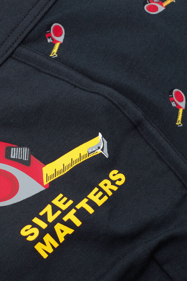 boxershorts för herr i mjuk, högkvalitativ, lätt stretchig bomull med mätstickmönster över hela plagget och ironisk text ”size matters” på framsidan.